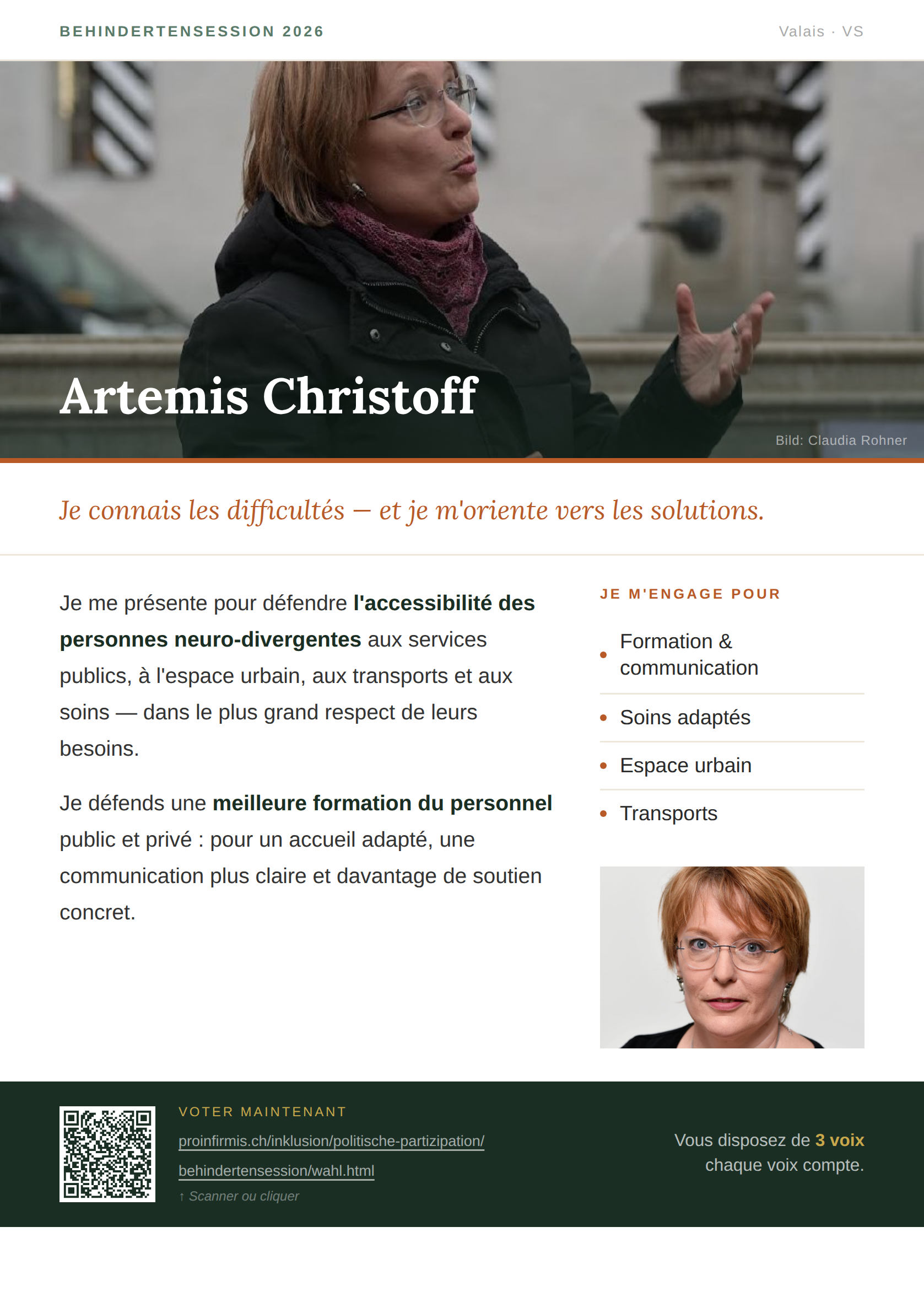 «Ich kandidiere für den Zugang neurodivergenter Menschen zu öffentlichen Dienstleistungen, Stadtraum, Verkehr und Gesundheitsversorgung. Ausgebildet, erfahren – ich kenne die Schwierigkeiten und die Lösungen. Für die Mahnwache für Theo in Brugg bin ich aus Sion angereist – weil unsere Anliegen die ganze Schweiz verbinden.»