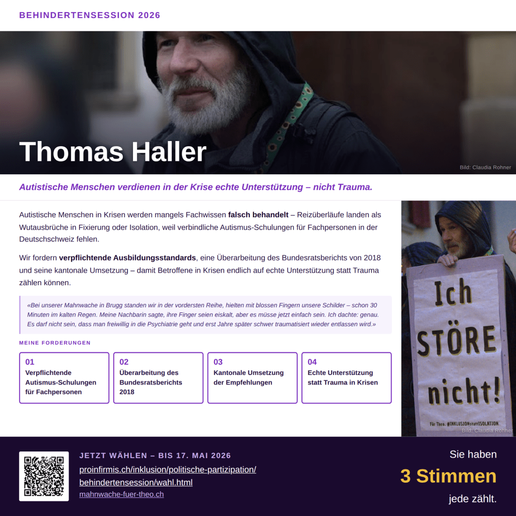 «Autistische Menschen in Krisen werden mangels Fachwissen falsch behandelt – Reizüberläufe landen als Wutausbrüche in Fixierung oder Isolation, weil verbindliche Autismus-Schulungen für psychologische Fachpersonen in der Deutschschweiz fehlen. Wir fordern verpflichtende Ausbildungsstandards, eine Überarbeitung des Bundesratsberichts von 2018 und seine kantonale Umsetzung – damit Betroffene in Krisen endlich auf echte Unterstützung statt Trauma zählen können.»