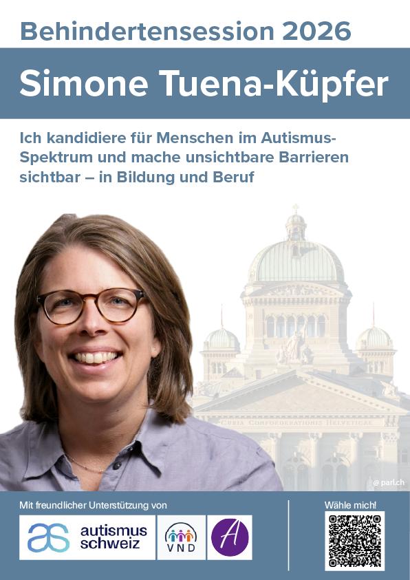 Am 21. Oktober 2026 tagen im Bundeshaus 44 gewählte Menschen mit Behinderungen – ein symbolisches Parlament für die 22 % der Schweizer Bevölkerung, die von einer Beeinträchtigung betroffen sind. Die Wahl läuft bis am 17. Mai 2026. Jede Person hat 3 Stimmen, auch kantonsübergreifend. Keine Schweizer Nationalität nötig.