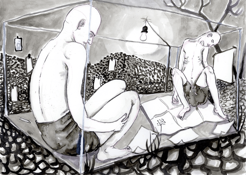 Welche psychischen und körperlichen Spuren hinterlässt ein langfristiger Aufenthalt in einem derartigen Raum? Zu Beginn könnte Theo noch der linken Figur ähneln – introvertiert, melancholisch, in sich zurückgezogen, im Zustand des Ausharrens. Mit der Zeit jedoch nahm er womöglich die Züge der rechten an: abgemagert, kraftlos, als hätte ihn jede innere Lebendigkeit verlassen. Die Isolation hatte nicht nur einen psychischen, sondern auch einen physischen Abbauprozess begünstigt.